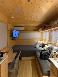 I’ll admit, I loved it too. The loft was super spacious and because you were higher up, it felt like a treehouse. Could I someday have my master bedroom loft be this open in a tiny house? I did a half-assed guesstimate of the height of the bus and the addition (most THOWS have a 13’ limit) – this seemed pretty close. I won’t mind at all sacrificing a little bit of headroom on the lower level under the master to give me that type of loft space – SOLD.